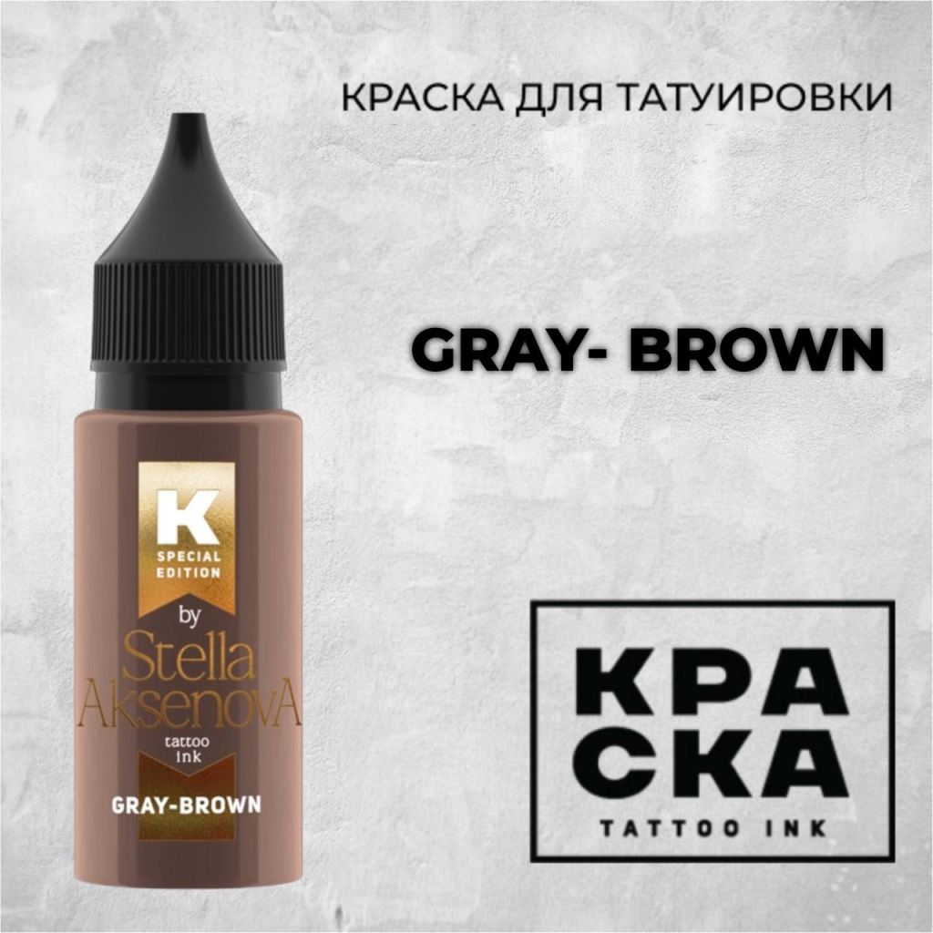 Gray Brown от КРАСКА Tattoo Ink — изысканный серо-красно-коричневый оттенок, созданный в соавторстве со Стеллой Аксеновой. Он сочетает в себе баланс тёплых и холодных тонов, создавая уникальный сложный цвет.