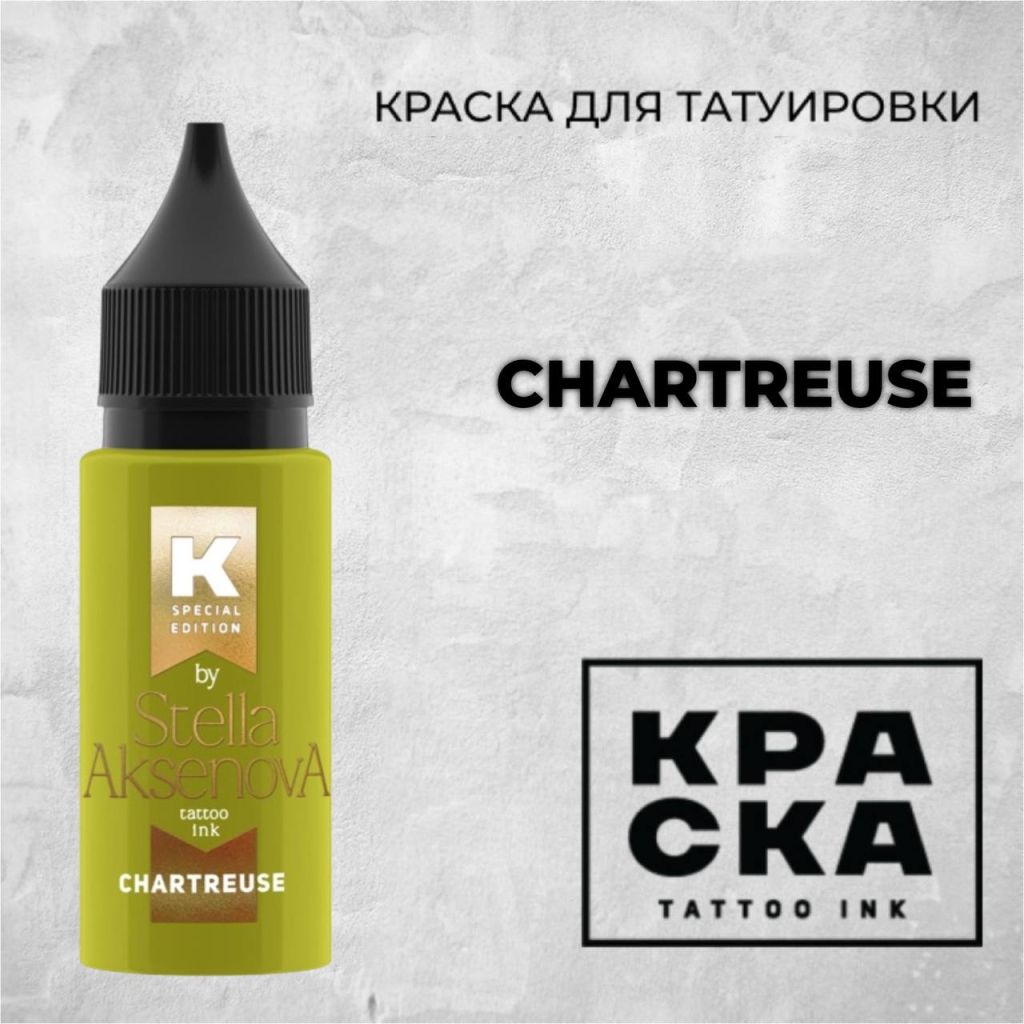 Chartreuse от КРАСКА Tattoo Ink — тёплый жёлто-зелёный оттенок, созданный в соавторстве со Стеллой Аксеновой. Свое название он получил от французского ликёра «зелёный шартрез», цвет которого обусловлен настоем из 130 трав.