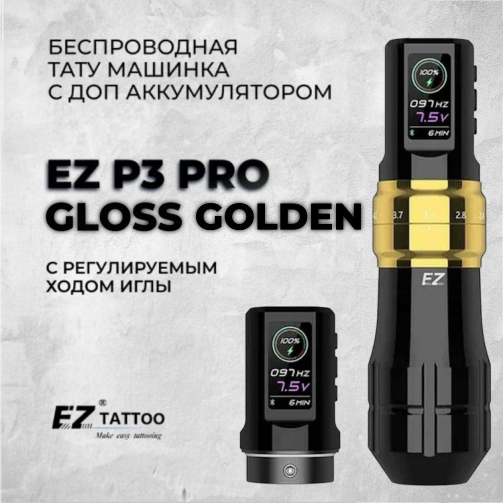 EZ P3 Pro Gloss Golden — профессиональная беспроводная тату-машинка с регулируемым ходом иглы и допо...